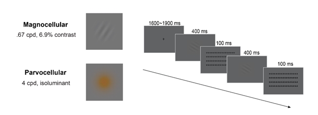 在实验一中,研究人员招募了52名被试,进行了跨度达16天的三次测试。通过呈现分别激活大细胞通路(M通路,负责运动/粗略轮廓)和小细胞通路(P通路,负责颜色/细节纹理)的Gabor光栅,并结合厌恶条件反射任务。