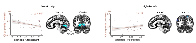 在低焦虑组中,1/f斜率与视觉皮层反应呈显著负相关(p = 0.04),即大脑抑制越强,视觉反应越小,说明“刹车”功能正常。