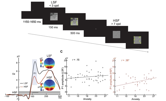 为了验证这一发现的生态效度,实验四将刺激材料换成了包含复杂信息的自然场景图片(如物体、风景)。结果显示,在自然场景中,主要激活P通路的高空间频率(HSF)图片,其诱发的脑电反应依然与特质焦虑呈显著正相关(r = 0.38)。而主要激活M通路的低空间频率(LSF)图片则无此相关(r = 0.04)。这一结果有力地证明,这种视觉过敏并非实验室的人造产物,而是焦虑个体在日常生活中真实面对的。