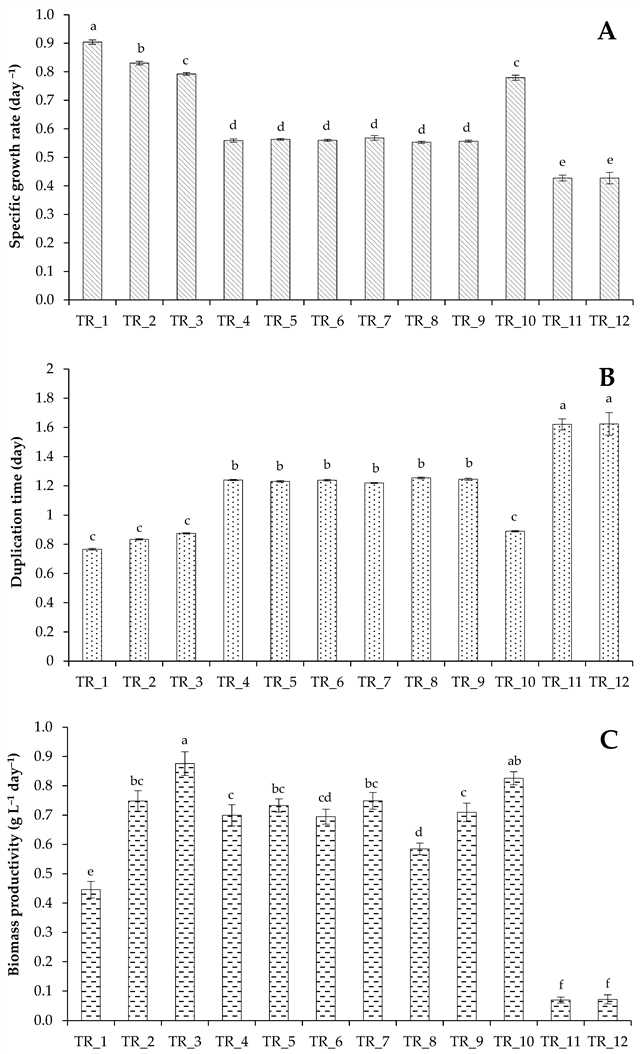 斜生藤黄菌培养物在本文所述策略下生长时的特定生长速率(A)、倍增时间(B)和生物量生产力(C)。未标注字母的平均值之间存在显著差异(采用图基方法,置信度为 95%)。