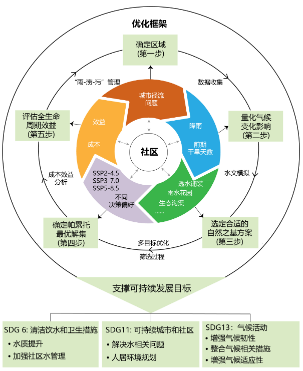 气候变化情景下降雨带来的城市社区内涝和污染,是城市水量调节和水质净化应协同破解的复合型水问题。自然之基方案(Nature-Based Solutions, NBS)是海绵城市和自净城市建设中协同解决社区“雨-涝-污”问题的重要共识。径流水量、污染负荷和治理成本是可持续发展目标(Sustainable Development Goals, SDGs) 框架下NBS科学设计、情景分析和定量评估的核心参数,三者的多目标优化权衡是社区“雨-涝-污”管理的关键科学问题。