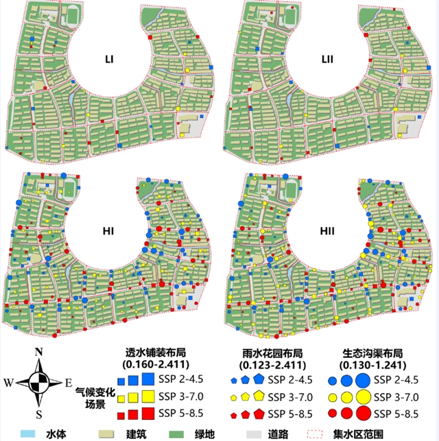 在不同情景下,透水铺装、雨水花园和生态沟渠呈现差异化空间配置特征(图3)。低成本优先且以径流削减为目标时,设施规模整体较小,透水铺装占主导并集中布局于关键汇流区(图3 LI)。低成本优先且以总氮去除为目标时,雨水花园和生态沟渠占比提升,沿交通道路和排水管道布设以强化总氮削减(图3 LII)。高径流削减优先时,三类设施规模明显扩大,透水铺装广泛分布于建成区以提升源头滞蓄(图3 HI)。高总氮去除优先时,雨水花园和生态沟渠沿水系密集布设以强化面源污染控制(图3 HII)。总体来看,NBS 配置在不同气候情景下呈现显著成本-效益权衡关系。