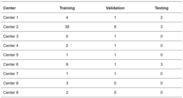 表2. 训练集、验证集与测试集中的各中心病例分布