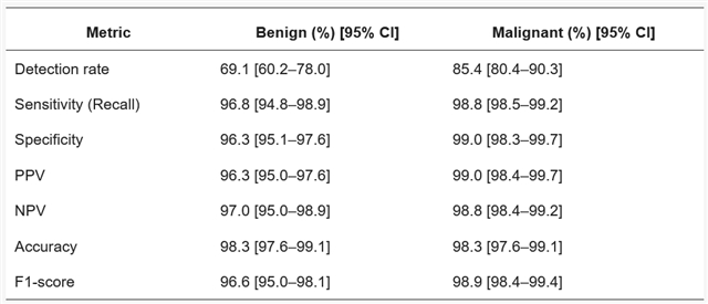 表3. AI模型在良恶性淋巴结检测与分类中的性能指标。