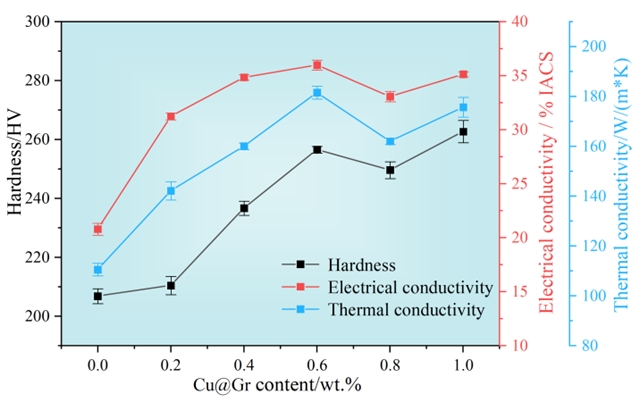 系统研究了Cu@Gr添加量(0、0.2、0.4、0.6、0.8、1.0 wt.%)对W-Mo-Cu复合材料的微观结构和性能的影响。结果发现,未添加Cu@Gr的样品微观结构疏松且存在明显孔隙;而当添加0.6 wt.% Cu@Gr时,W-Mo-Cu复合材料具有均匀致密的微观结构,铜相分布连续,界面结合良好,综合性能最优。具体表现为:较未添加Cu@Gr的样品,W-Mo-Cu复合材料的相对密度提升至98%,提高约8%;热导率和电导率分别提升至181.54W/(m·K)和35.99%IACS,增幅分别为64%和73%;维氏硬度也提高24%,达到256.57HV(图2)。