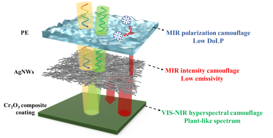 本研究通过基于粗糙表面、银纳米线与仿生涂层的分层结构设计,实现了单一器件集成可见-近红外植被光谱模拟以及红外低辐射率、低偏振度的光学特性,以应用于对强度、光谱和偏振兼容的多维度伪装。研究团队还对。这一成果不仅为基于偏振特性的隐身技术提供了可行性验证,还为对抗多模态成像,电磁波多维度协同调控等方向提供了重要的技术支持。(来源:LightScienceApplications微信公众号)