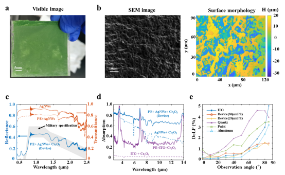 图2. (a)多维度伪装器件的可见图像(PE侧); (b)器件的SEM图像和表面形貌; (c)器件的可见-近红外漫反射光谱(PE侧)和顶部有和没有PE层的AgNWs的透射光谱; (d)不同材料制备的器件的测量中红外辐射光谱; (e)中红外线偏振度的角度特性。