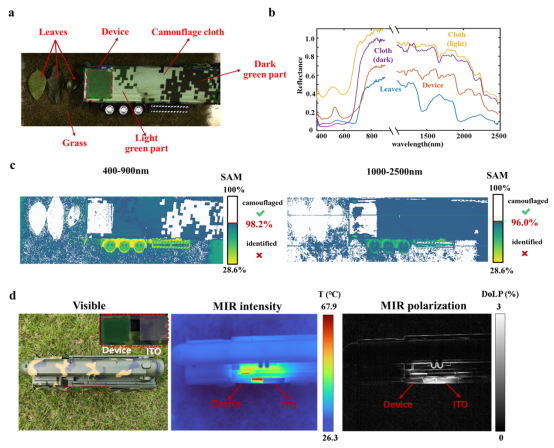 为进一步验证其在实际应用场景下的伪装性能,研究团队将该器件与载具模型放置在草坪上,采用高光谱相机与红外偏振相机进行观察,模拟对地面目标进行的多维度探测。可以看到在可见-近红外高光谱相机下,器件与植被的光谱相似度达到了96%以上(图3b);并且在光谱角度匹配的分类算法中(图3c),器件在整个400-2500 nm波段内均能够有效地欺骗分类算法,将自身伪装成与叶片、草地相似的植被背景。而在红外偏振相机的观察中(图3d),在80 ℃内部热源的加热下的地面目标,其器件覆盖区域不仅能够在红外强度图像中较好地融入低辐射背景,同时在偏振图像中也能够以远低于ITO薄膜样品的偏振强度实现良好的伪装效果。