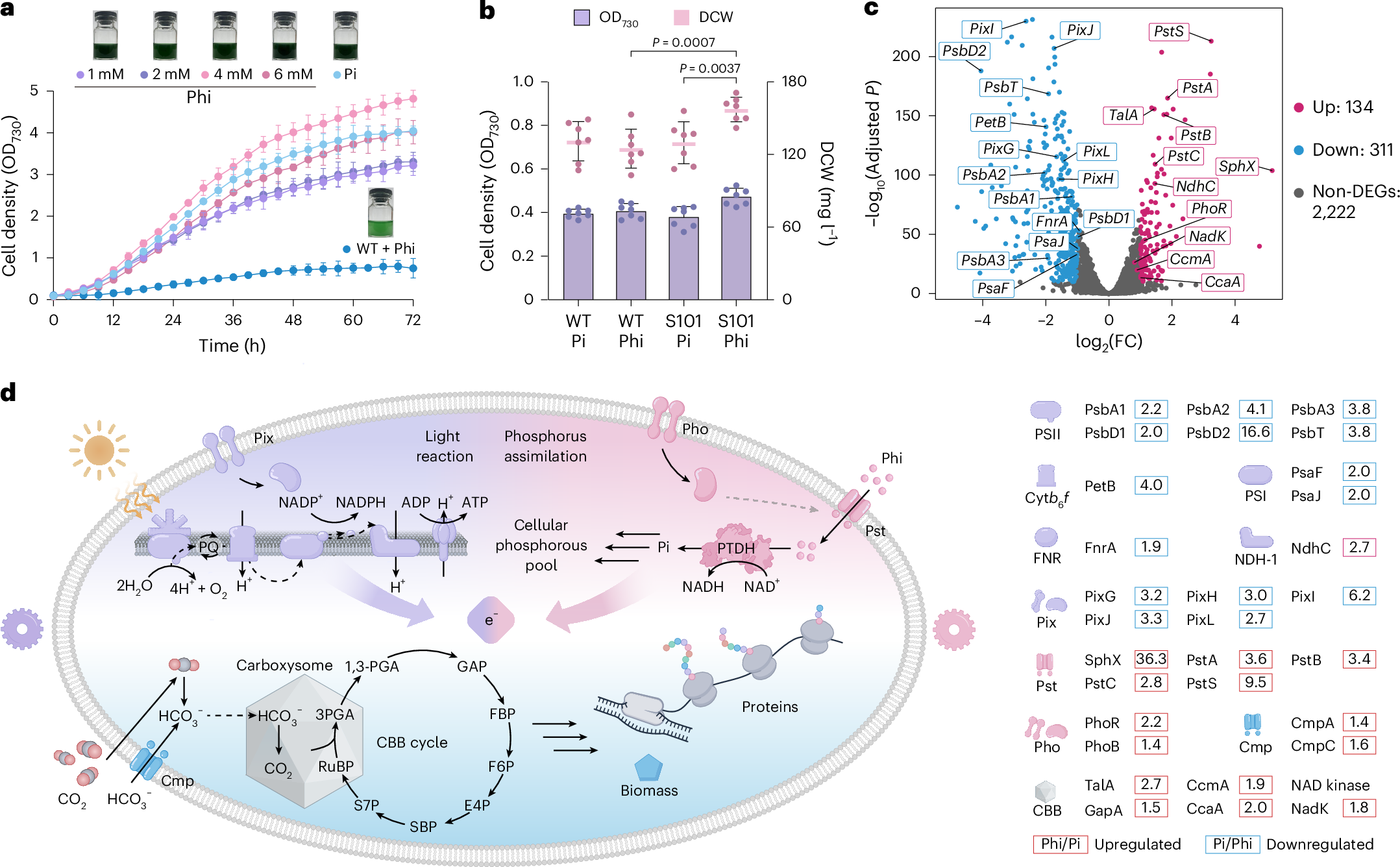 在这项工作中,研究人员开发了SCHB系统,结合了光能与无机化学能的优势,通过将基于废水的无机磷回收过程整合到光合微生物代谢路径中,实现了高效、低成本的生物催化转化。研究人员以蓝藻为底盘细胞,引入亚磷酸盐脱氢酶,使其能够利用亚磷酸盐。转录组学分析表明,亚磷酸盐的氧化有效补偿了光反应减弱带来的影响,重塑了胞内的氧化还原和能量状态。