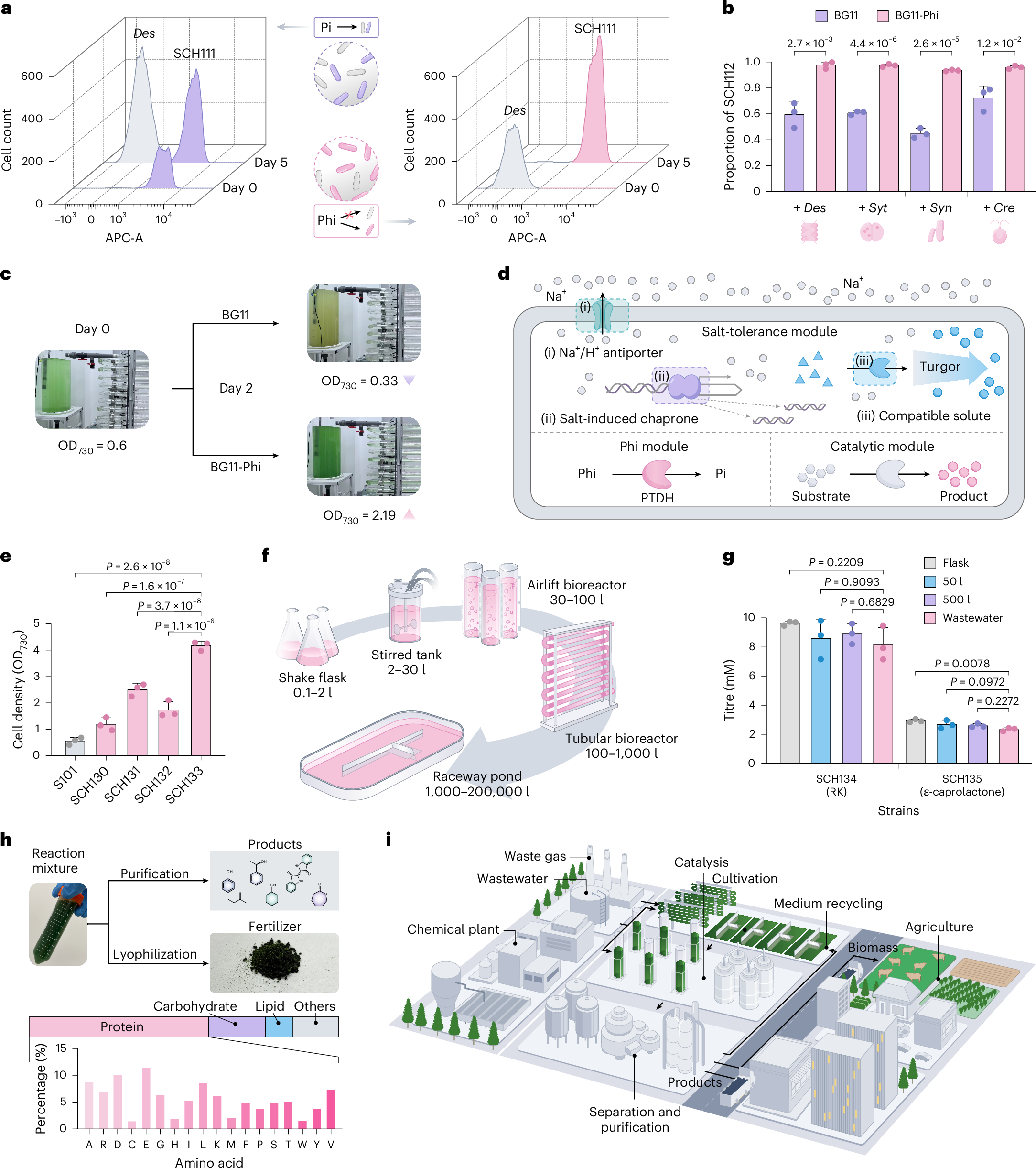 针对杂菌污染问题,SCHB系统在与多种污染微生物的混合培养中占据98%以上的绝对优势,表明其具有良好的抗污染能力。为了克服真实废水中高盐度对细胞生长的抑制,研究团队筛选获得了钠-氢离子逆向转运蛋白作为耐盐模块,成功在500 L管式光反应器中,直接利用真实工业废水实现了SCHB体系的免灭菌放大培养,实现了多种化学品的规模化生产,同时回收了废水中70%以上的氨,收集的生物质可作为优质的肥料和饲料。