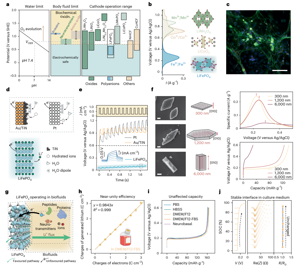 围绕这一目标,文章首先建立了从研究概念、材料选择到应用定位的整体框架,并最终将核心材料聚焦到磷酸铁锂。随后,研究系统考察了LiFePO4在复杂生物液体中的电化学行为、离子释放特性、生物相容性和储锂稳定性。结果表明,LiFePO4相比传统电极材料更适合在生理环境中工作:它能够在较低电位下实现脱锂,从而降低副反应风险;同时,其电荷输入能够较高效地转化为锂离子输出,表现出良好的界面稳定性和生物适用性,为后续器件构建和神经调控实验奠定了材料基础。