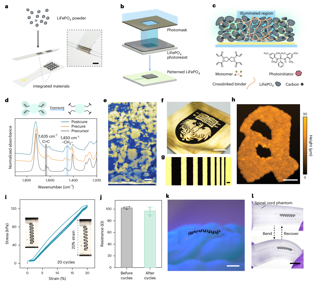 在证明LiFePO4具备合适的材料属性后,研究重点进一步转向器件构建。由于磷酸铁锂本质上是颗粒型正极材料,要将其真正加工成可贴附、可图案化、可植入的柔性器件并不容易。为此,团队发展了正极材料的直接光图案化方法,使LiFePO4颗粒能够被稳定集成到柔性基底上,形成适用于生物界面的薄膜电极。这一步完成了从“材料可行”到“器件可用”的跨越,也使原本更常见于储能器件中的无机颗粒材料,真正进入了柔性生物电子器件的语境。