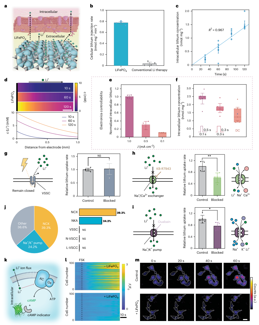 在多种可能参与神经调控的离子中,锂离子具有特殊意义。长期以来,锂盐已被用于临床,并被认为能够通过多种细胞内通路影响神经系统活动。不过,传统锂盐治疗通常依赖全身递送,难以在目标组织实现高效、局部、可控的作用。基于这一认识,该工作并未将锂简单视为一种化学成分,而是希望借助成熟电池材料中“储锂—释锂”的可控过程,在器件与组织界面建立一种局部、精准、可编程的锂离子递送方式。