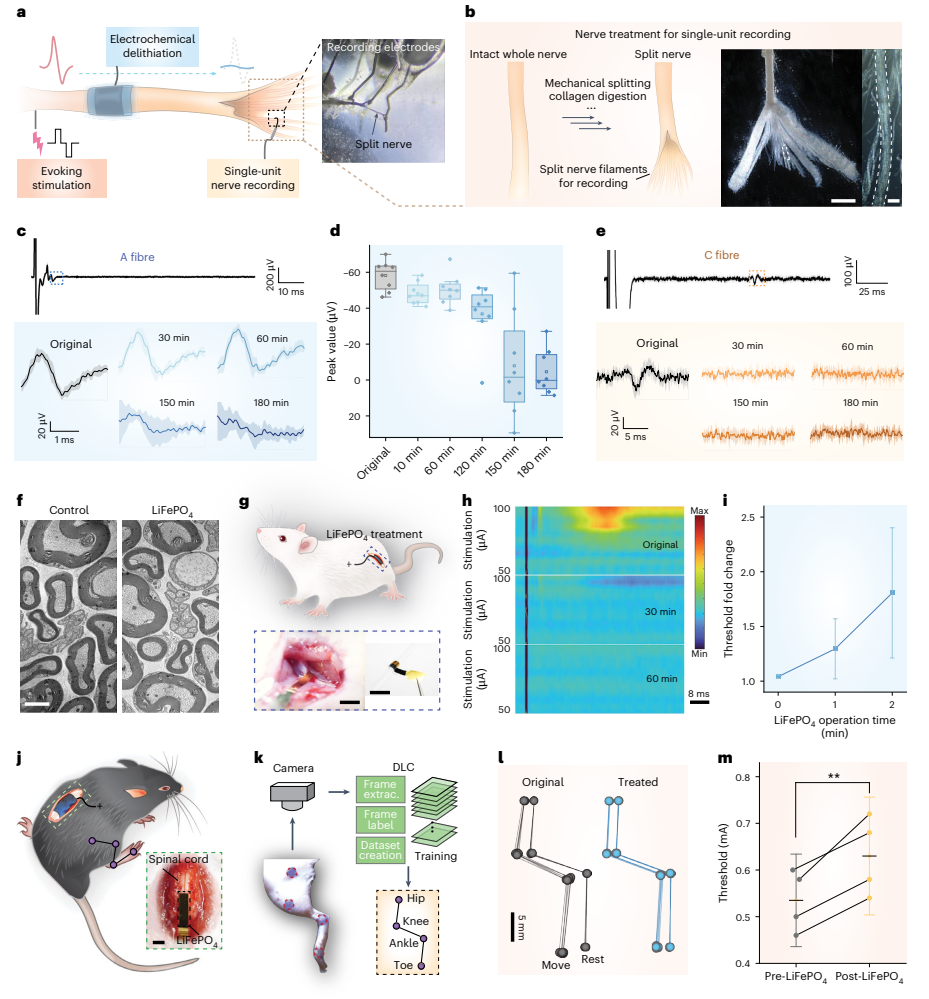 在器件建立之后,文章进一步验证了这一平台在细胞尺度和神经调控层面的功能输出。结果显示,LiFePO4电极释放的锂离子不仅是局部的、可控的,而且能够被细胞有效感知并转化为具体的生物学效应。进一步地,在外周神经和中枢神经相关模型中,这一柔性器件均表现出明确的神经抑制能力。与传统锂盐处理方式相比,这种策略的关键优势在于:它并不依赖全身性给药,而是在目标组织界面形成局部高浓度锂离子环境,从而实现持续且空间受限的神经抑制,并有望降低系统性副作用风险。