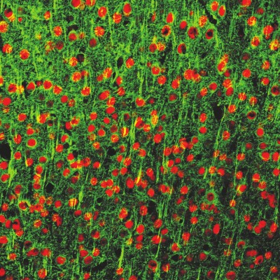果实累累——大鼠脑片荧光染色。中科院上海药物所张蕾摄