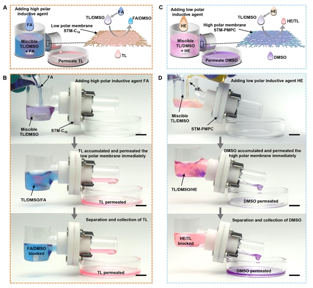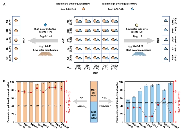 研究团队发展了一种基于极性/非极性协同相互作用驱动的超浸润膜分离策略(PNISMS),成功地实现了对一系列不同极性范围互溶有机液体的低能耗、高通量分离。