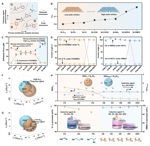 分离依赖极性/非极性协同相互作用。作者系统地研究了分离膜和诱导剂的极性在分离过程中所起的作用。研究表明,相反极性的分离膜和诱导剂可同时分别与甲苯和二甲基亚砜形成强的非极性/极性相互作用,使甲苯(或二甲基亚砜)选择性浸润分离膜,而均相液体中的另一组分在诱导剂的拖拽下被有效阻挡,最终实现了互溶液体的有效分离。