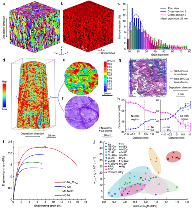 图1:Ni50Co50合金中由纳米尺度晶粒(a、b、c)和晶内多尺度成分起伏(d、e、f)构成的复合纳米结构。成分起伏呈三维网络分布(g),且不同成分的区域之间由“成分边界”分隔开来(h)。(i)Ni50Co50合金的拉伸工程应力应变曲线。图中还给出了纳米晶Ni、纳米晶Co和多层纳米结构NiCo合金在相同应变速率下的拉伸曲线作为参考和对比。(j)纳米晶金属材料屈服强度-强塑积关系图。在不同应变速率下测得的不同批次的纳米晶Ni50Co50合金的性能用红色五角星表示。
