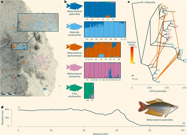 该团队跨过澳大利亚湿热带的海拔梯度范围,评估了彩虹鱼(Melanotaenia spp.)近亲物种的环境生态位模型和基因组脆弱性。与纯粹的狭义的地方性物种相比,广泛分布的通才种群和几个恶劣环境中的地方性物种之间的杂交种群,对预测气候的敏感性更低。基因渐渗和自适应基因组区域之间的重叠与自适应基因渐渗的信号一致。研究结果强调,杂交种群的保护价值常常被低估,表明适应性渗透可能有助于在恶劣环境范围内的进行物种的进化拯救。