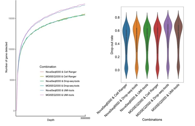 鉴于此,我们从公共数据库中下载了经由NovaSeq6000与MGISEQ2000两种平台测序的相同样本的数据,并应用三种常见的数据处理软件Drop-seq-tools、UMI-tools、Cell Ranger分别对该数据进行处理从而得到了六种平台-处理流程的组合,最终从灵敏度、准确性、下游分析三个角度计算出评估指标。其中灵敏度被定义为测序深度变化区间内被测到的基因数目(如图1左)、准确性的评估指标我们使用的则是表达缺失的比率(如图1右)。