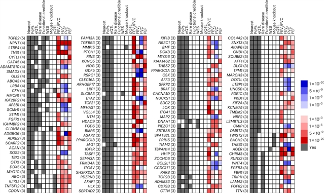 Abstract: Lung-function impairment underlies chronic obstructive pulmonary disease (COPD) and predicts mortality. In the largest multi-ancestry genome-wide association meta-analysis of lung function to date, comprising 580,869 participants, we identified 1,020 independent association signals implicating 559 genes supported by ≥2 criteria from a systematic variant-to-gene mapping framework. These genes were enriched in 29 pathways. Individual variants showed heterogeneity across ancestries, age and smoking groups, and collectively as a genetic risk score showed strong association with COPD across ancestry groups. We undertook phenome-wide association studies for selected associated variants as well as trait and pathway-specific genetic risk scores to infer possible consequences of intervening in pathways underlying lung function. We highlight new putative causal variants, genes, proteins and pathways, including those targeted by existing drugs. These findings bring us closer to understanding the mechanisms underlying lung function and COPD, and should inform functional genomics experiments and potentially future COPD therapies.