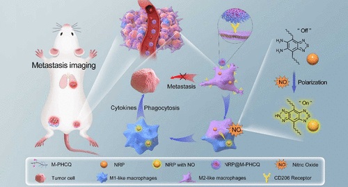 Abstract: Tumor-associated macrophages, especially M2-like macrophages, are extensively involved in tumor growth and metastasis, suppressing the innate immunity to help tumor cells escape and reshaping the microenvironment to help metastatic cells grow. However, in vivo, real-time visualized migration of M2-like macrophages has never been explored to monitor the tumor metastasis process. Herein, we prepared an M2-like macrophage-targeting nitric oxide (NO)-responsive nanoprobe (NRP@M-PHCQ) consisting of an amphiphilic block copolymer with mannose and hydroxychloroquine (HCQ) moieties (denoted as M-PHCQ) and a NO-responsive NIR-II probe (denoted as NRP). The mannose moieties provided M2-like macrophage-targeting capacity, and the HCQ moieties polarized M2-like macrophages to M1-like ones with enhanced NO secretion. Consequently, NRP@M-PHCQ was lit up by the secreted NO to visualize the migration and polarization of M2-like macrophages in real time. In vivo metastasis imaging with NRP@M-PHCQ successfully tracked early tumor metastasis in the lymph nodes and the lungs with high sensitivity, even superior to Luci-labeled bioluminescence imaging, suggesting the extensive distribution and critical role of M2-like macrophages in tumor metastasis. In general, this work provided a new strategy to sensitively image metastatic tumors by tracking the polarization of M2-like macrophages and visually disclosed the critical role of M2-like macrophages in early tumor metastasis.
