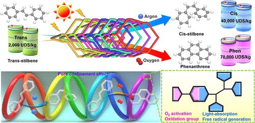 Abstract: The selective photoisomerization or photocyclization of stilbene to achieve value upgrade is of great significance in industry applications, yet it remains a challenge to accomplish both of them through a one-pot photocatalysis strategy under mild conditions. Here, a sevenfold interpenetrating 3D covalent organic framework (TPDT-COF) has been synthesized through covalent coupling between N,N,N,N-tetrakis(4-aminophenyl)-1,4-benzenediamine (light absorption and free radical generation) and 5,5′-(2,1,3-benzothiadiazole-4,7-diyl)bis[2-thiophenecarboxaldehyde] (catalytic center). The thus-obtained sevenfold interpenetrating structure presents a functional pore channel with a tunable photocatalytic ability and specific pore confinement effect that can be applied for selective stilbene photoisomerization and photocyclization. Noteworthily, it enables photogeneration of cis-stilbene or phenanthrene with >99% selectivity by simply changing the gas atmosphere under mild conditions (Ar, SeleCis. > 99%, SelePhen. < 1% and O2, SeleCis. < 1%, and SelePhen. > 99%). Theoretical calculations prove that different gas atmospheres possess varying influences on the energy barriers of reaction intermediates, and the pore confinement effect plays a synergistically catalytic role, thus inducing different product generation. This study might facilitate the exploration of porous crystalline materials in selective photoisomerization and photocyclization.
