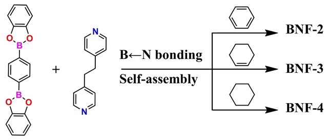 图1:硼酸酯单体BACT和吡啶单体PDE自组装形成开孔(BNF-2)和密闭(BNF-3和BNF-4)的B←N框架。