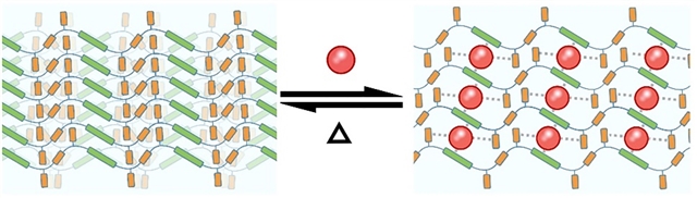 图2:BNF框架在密闭(左)和开孔(右)结构之间的可逆转换。红球、橙色条和绿色条分别代表苯分子、硼受体和吡啶供体。
