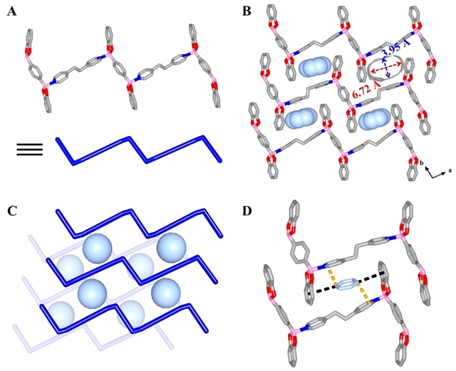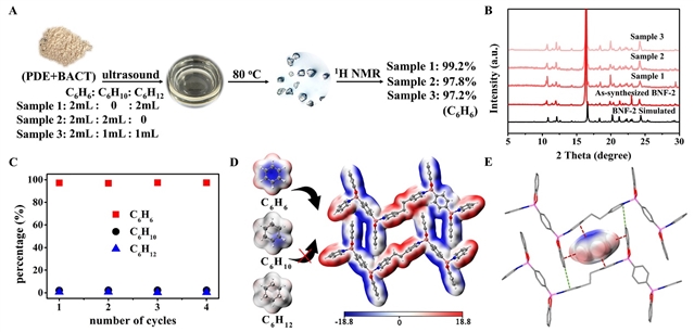 新型B←N框架(BNF-2)由两个有机成分1.4苯二硼酸邻二苯酚酯(BACT)和1,2-二(4-吡啶基)乙烷(PDE)在纯苯溶液中通过B←N键自组装形成。该材料的最小孔径尺寸(3.95 × 6.72 Å2)略大于苯(C6H6, 3.23 × 6.63 Å2)的最小截面,但小于环己烯(C6H10, 5.36 × 7.03 Å2)和环己烷(C6H12, 4.98 × 6.58 Å2)。苯分子可以通过多重弱的C-H··π和π-π相互作用被封装在晶体空腔中。