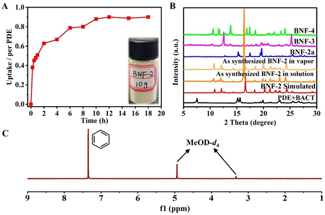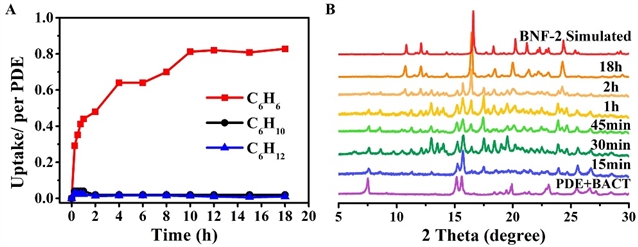 通过时间变化的蒸汽吸附实验,作者证实了BNF-2对C6H6的吸附能力。实验表明,BNF-2对C6H6的吸收量在第一个小时急剧增加到0.5 mol/PDE,然后在10 h内逐渐增加到0.88 mol/PDE,18 h时C6H6的吸附量为0.9 mol/PDE,接近BNF-2的理论值1 mol/PDE。通过气相合成可以很容易地制备出克级的BNF-2,并且通过PXRD图证实了其相纯度。有趣的是,BNF-2中的C6H6客体在加热活化过程中很容易脱附,C6H6的纯度接近100%,这对实际工业分离至关重要。