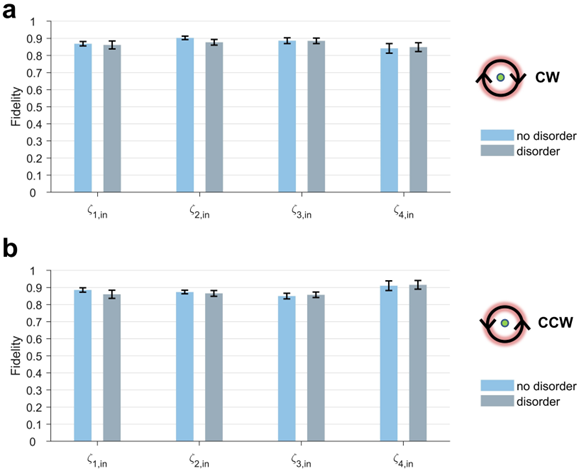 研究者在自由空间光学平台上,实现了对应图1a的量子行走。并且展示了如图2中不同量子纠缠态环绕四阶奇异点的手性调控结果。更为重要的是,通过在参数中引入无序后,可以从图3a中看出,和不加无序性相比,顺时针环绕奇异点的量子纠缠态演化结果几乎没有改变,保真度的数值也验证了这一点。同样的鲁棒性也可以在逆时针环绕奇异点的量子纠缠态演化结果中发现,见图3b。上述研究证明,围绕奇异点的量子纠缠态手性调控具有很强的鲁棒性。