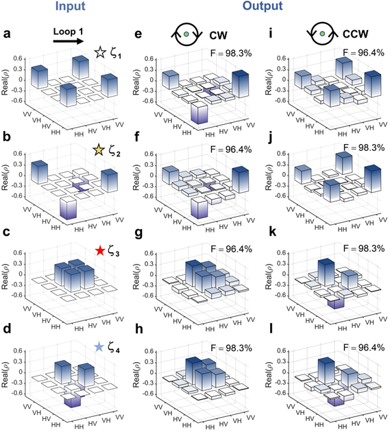 论文作者利用多个演化算符构造出具有四阶简并奇异点的非厄米量子行走。如图1a所示。通过选择旋转算符R(θ)的参数θ和对称性破缺算符ψ(φ)的参数φ,可以实现如图1b所示的准能量分布。其中四个能量面被分成两组,各组都是两两简并的黎曼能量面。其中四阶简并奇异点被标记为绿色球。而在演化中起始点对应的四个量子纠缠态(其中|ζ1,2〉=(|00〉± |11〉/√2),|ζ3,4〉=(|01〉±|10〉/√2))则用白、黄、红和蓝色的星星指代。如果在每一步的量子行走中,按照图1c所示改变参数θ和参数φ的值,就可以形成环绕奇异点的演化路径1和不环绕奇异点的演化路径2。