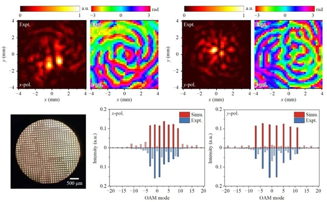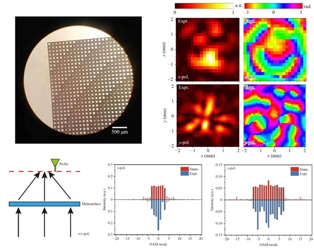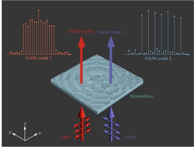 电磁波的轨道角动量作为一种新自由度,超越了传统的频率、相位和幅度,有望推动信道容量的无限扩展。近日,北京大学杜朝海研究员团队与上海理工大学臧小飞教授课题组展开深入合作,基于双方在太赫兹和超表面领域的研究基础,提出了一种利用全硅介质超表面生成极化复用的太赫兹涡旋光梳的新方法。该研究将太赫兹涡旋光梳的概念与超表面技术相结合,通过对全硅介质超表面的精心设计、精密加工和系统测试,实现了对涡旋光梳模式数量、位置和间隔的灵活控制,从而成功生成双极化太赫兹涡旋光梳,推动超高容量太赫兹多模通信技术的发展。