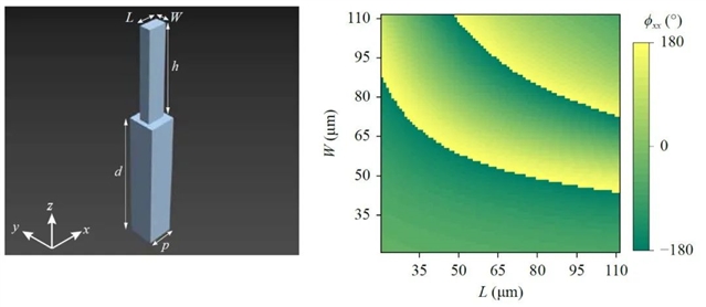 研究人员采用全硅介质的长方柱状结构来设计极化复用的超原子,这种结构具有较强的双折射特性。通过精心选取具有不同几何结构的超原子,其透过的x和y两种线极化的太赫兹波的相位可以同时控制,可覆盖整个360°的范围。