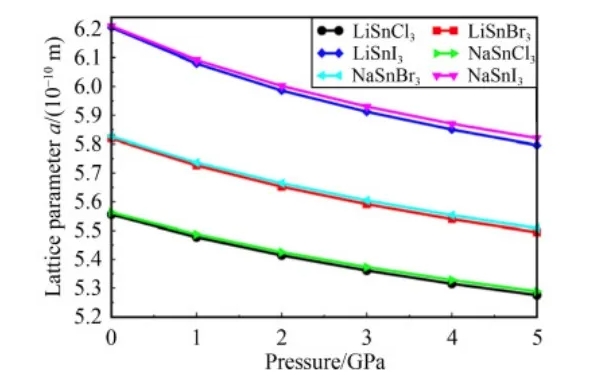 图2说明了晶格常数为施加压力的函数。在所研究的所有材料中,晶格常数都随着压力的增加而不断减小。虽然阳离子从Li替换为Na导致晶格常数的变化相对较小,但Cl替换为I导致了更明显的变化,突出了阴离子大小对结构性质的重要影响。