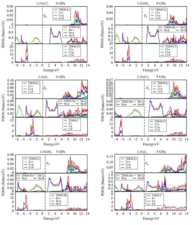 图5 环境压力和5 GPa下,LiSnCl3、LiSnI3和LiSnBr3的总态密度和部分态密度