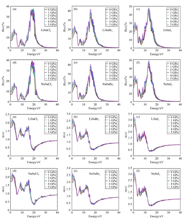 如图6所示,化合物LiSnCl3、LiSnBr3、LiSnl3、NaSnCl3、NaSnBr3和NaSnl3在0压力下的可见光区折射率值最高。折射率在紫外区持续降低,直到Li/NaSnCl3、Li/NaSnBr3和Li/NaSnl3分别达到约20、17和15 eV的值。值得注意的是,有几个不稳定的峰值在30、28和25 eV持续超过这一点。