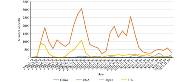 图3 中国、美国、日本和英国的COVID-19死亡数