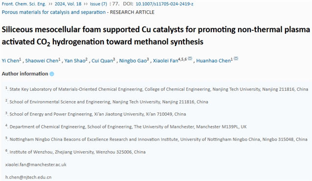 南京工业大学化工学院陈焕浩教授和英国曼彻斯特大学工程学院范晓雷博士等在《Frontiers of Chemical Science and Engineering》发表了题为“Siliceous mesocellular foam supported Cu catalysts for promoting non-thermal plasma activated CO2 hydrogenation toward methanol synthesis”(硅基介孔泡沫负载型铜催化剂用于促进非热等离子体活化CO2加氢制甲醇)的研究论文,文章聚焦于硅基介孔泡沫(MCF)负载铜基催化剂的设计,通过调控载体孔结构与金属活性位点,提升了NTP催化CO2加氢制甲醇的效率与选择性。