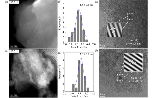 图1 (a-c) Cu1/MCF和(d-f) Cu1Zn1/MCF的高角环形暗场像、粒径分布及高分辨率透射电镜显微图。