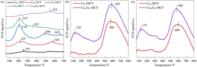 图2 Cu1/MCF和Cu1Zn1/MCF的(a) 氢气程序升温还原、(b) 二氧化碳程序升温脱附及(c) 一氧化碳程序升温脱附谱图。