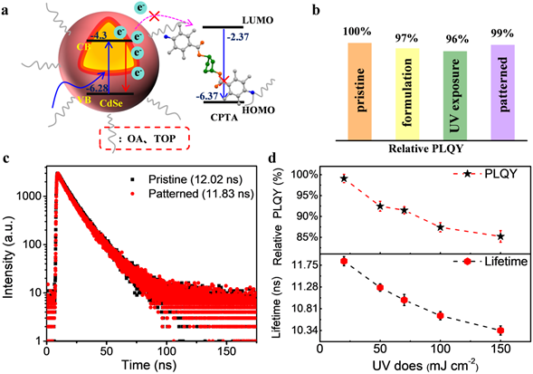 图3:图案化量子点的PL特性。(a) 红色量子点和交联剂CPTA的能级示意图; (b) QD薄膜在不同图案化阶段的相对PLQY: 原始,混合(QDs + 10 wt%的CPTA), 紫外曝光(20 mJ cm-2)和图案化; (c) 原始和图案QD薄膜的荧光寿命; (d) 不同UV剂量CPTA对QD膜的相对PLQY和寿命的影响