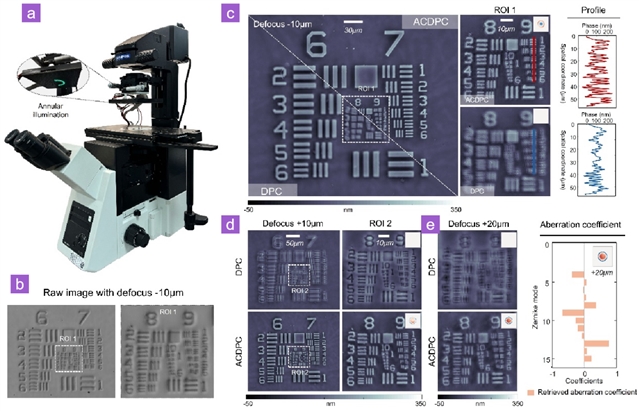 图 3 USAF分辨率目标实验。(a)基于商用倒置显微镜的环形照明ACDPC实验系统;(b)实际获取的强度图像和感兴趣区域(ROI 1)的放大图像;(c) DPC和ACDPC在-10 μm离焦下的全视场重建相位和放大图像(ROI 1),以及定量相位剖线;(d) DPC和ACDPC 在+10 μm离焦下的重建相位和放大图像(ROI 2);(e) +20 μm离焦下DPC和ACDPC的重建相位以及像差系数
