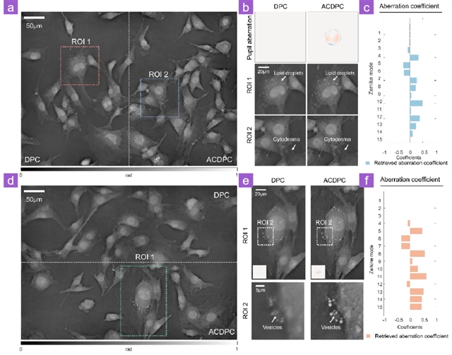 图 4 DPC和ACDPC在NIH 3T3细胞上的实验结果。(a)在精细聚焦条件下对NIH 3T3细胞样本进行DPC和ACDPC实验的结果;(b)图(a)中两个感兴趣区域(ROI 1、ROI 2)的放大图像;(c)图(b)中重建像差的Zernike系数;(d)在粗聚焦条件下对NIH 3T3细胞样本进行DPC和ACDPC实验的结果;(e)图(a)中ROI (ROI 1)的放大图像及其感兴趣区域(ROI 2)的放大图像;(f)图(e)中重建像差的Zernike系数