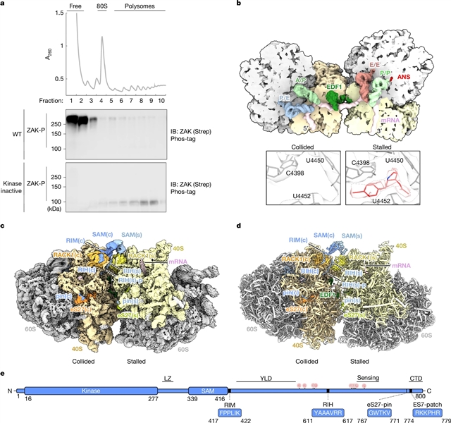 在这里,该研究组结合生物化学和低温电子显微镜来发现不同的ZAK-核糖体相互作用所需的组成招募和激活。该团队发现,在诱导核糖体碰撞时,ZAK与核糖体蛋白RACK1之间的相互作用使其在碰撞界面上通过其SAM结构域的二聚化而激活。