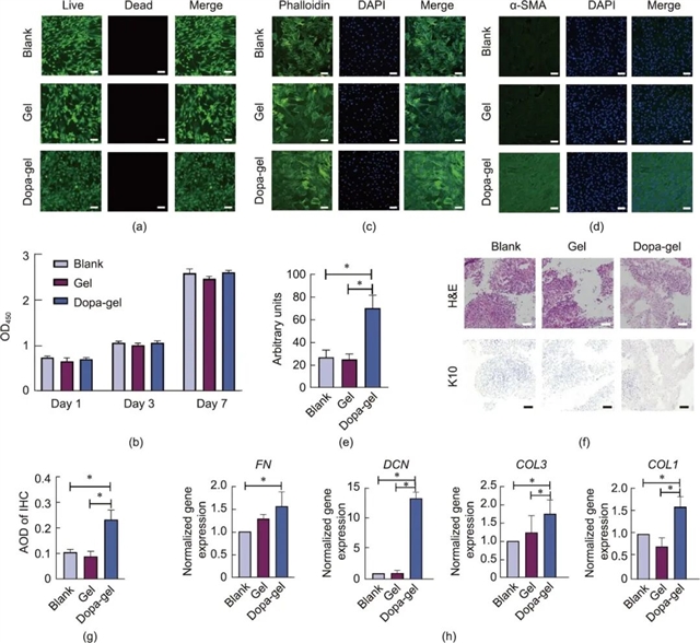 图3 (a)用Dopa-gel和Gel处理7天后,CP-R237细胞的活/死染色图像。绿色和红色标记的细胞分别代表活细胞和死细胞。比例尺:200 μm。(b)培养7天后的细胞存活率;(c)培养7天后的细胞骨架染色。比例尺:200 μm。(d)α-SMA的免疫荧光染色结果。比例尺:200 μm。(e)α-SMA的半定量分析结果。(f)H&E染色和K10的免疫组化染色结果。比例尺:200 μm。(g)K10的半定量分析结果。(h)用Dopa-gel和Gel处理7天后,CP-R237细胞FN、DCN、COL3和COL1表达的qPCR分析结果。数据表示为平均值±标准差,星号表示组间存在统计学差异(*p < 0.05)。