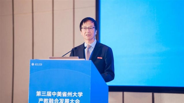 姜建明在欢迎辞中指出,本次大会聚焦产教融合协同育人实践,期待中美省州高校携手合作赋能区域经济高质量发展。姜建明提出三点倡议:一是提高联合培养人才质量,提升中美人才培养计划121项目层次,进一步扩大中美学位联授学生规模;拓展硕士和博士联合培养项目;开展访问学生、研学交流和带薪实习等项目。二是建设中美产教融合平台,以国际产业学院为载体,让更多中美高校与企业建立对话合作关系,通过教师交流开展科研合作,实现技术攻关和成果转化。三是推动中美民间人文交流,持续开展“5年邀请5万名美国青少年来华交流学习”,让更多美国青年通过121平台来华开展主题工作坊、专业交流和实践实习;带动更多中美青年举办丰富多彩的开放日和文化交流活动。