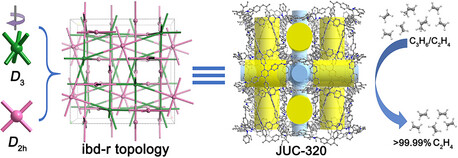 近日,吉林大学孙福兴团队报道了3D共价有机框架从可扭曲的构建块到前所未有的ibd-r拓扑,用于高效的C3H6/C2H4分离。相关论文发表在2025年12月16日出版的《德国应用化学》杂志上。