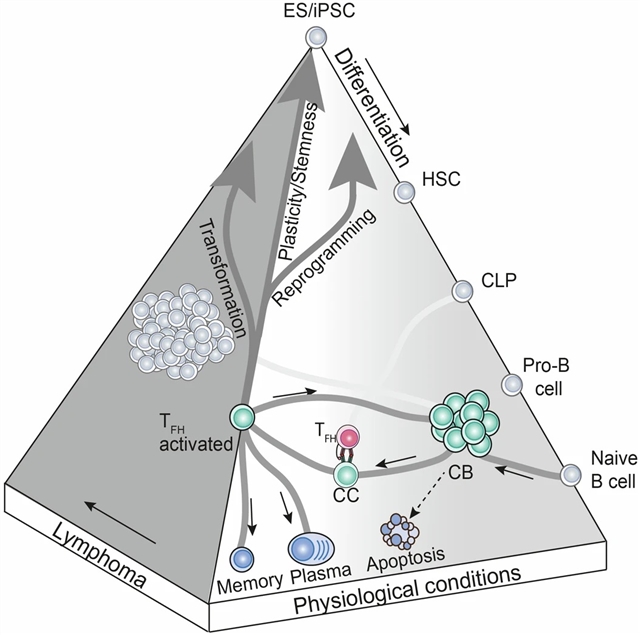 Abstract: During the germinal centre (GC) reaction, mature B cells undergo rapid and reversible phenotypic shifts that are essential for adaptive immunity. Here we report that GC B cells, unlike other mature B cells, transiently acquire a unique epigenetic plasticity, demonstrated by their enhanced capacity to reprogram to induced pluripotent stem cells. This plasticity depends on T follicular helper (TFH) cells and is not due to increased proliferation or MYC activation. Instead, it involves weakening of B-cell identity and derepression of stem and progenitor programs driven by NF-κB and other TFH-derived signals. Thus, physiological GC plasticity is tightly constrained by the affinity maturation process of positive selection. Loss of histone 1, a chromatin compaction regulator restricting the accessibility of embryonic stem cell programs, further enhances GC plasticity by bypassing this gatekeeping mechanism. Importantly, patients with B-cell lymphoma enriched for GC plasticity signatures had worse outcomes, suggesting that this mechanism may also contribute to lymphomagenesis.